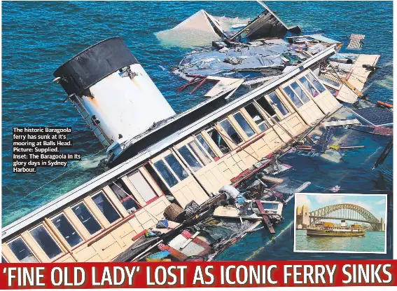 1 day agoA historic former Manly ferry has sunk in Sydney Harbour following a decades-long push for the dilapidated vessel to be restored. Iconic former Manly ferry MV Baragoola sinks in Sydney Harbour. Police said the 99-year-old MV Baragoola began taking water from his mooring next to the Balls Head Reserve Coal Loader in a suburb on the north coast of Waverton at around 1030pm.